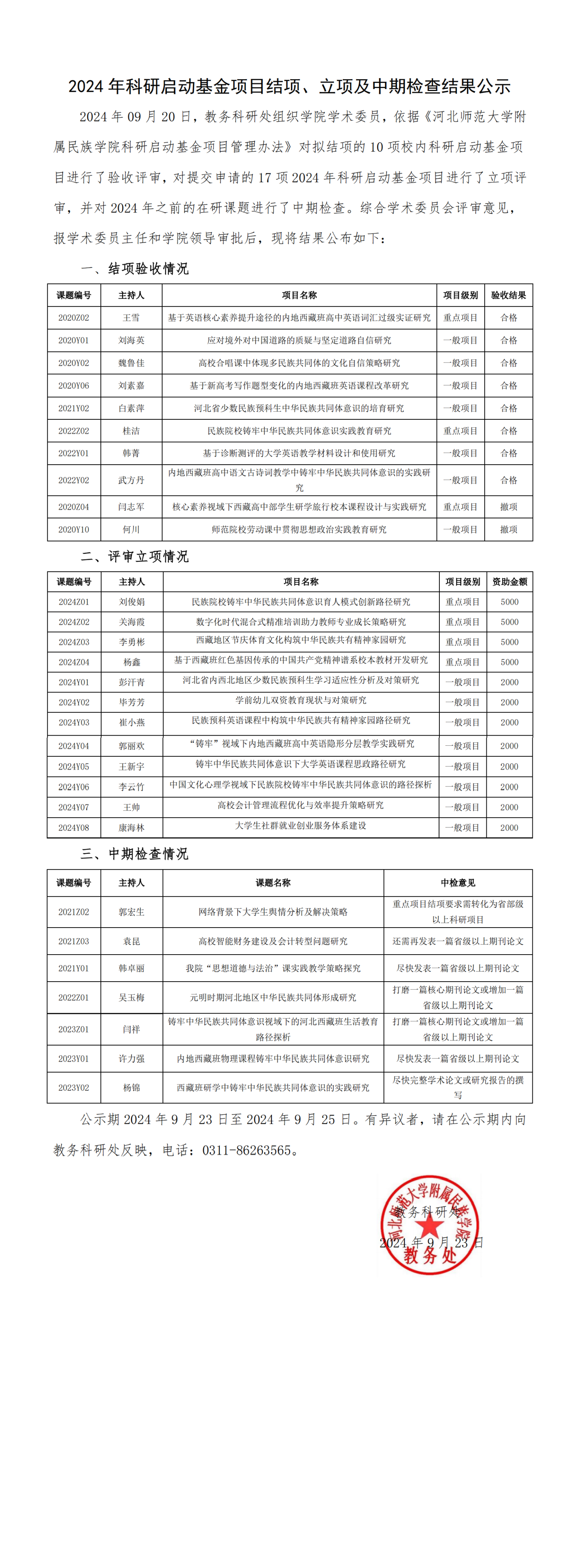 2024年科研启动基金项目结项、立项及中期检查结果公示